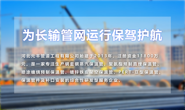 河北元豐管道工程有限公司始建于2013年,注冊資金2218萬元。是一家專注生產(chǎn)鋼套鋼蒸汽保溫管、聚氨酯預制直埋保溫管、噴涂纏繞預制保溫管、鍍鋅鐵皮架空保溫管、PERT-Ⅱ型保溫管、保溫管件及補口安裝的綜合性研發(fā)型服務(wù)企業(yè)。